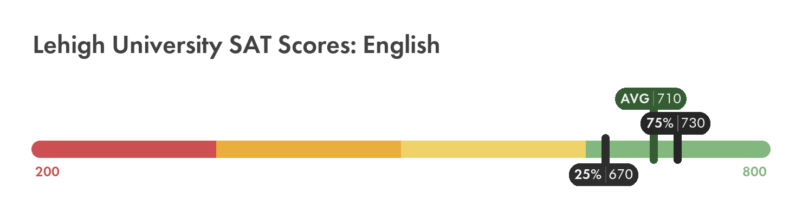 Lehigh’s average SAT English score is 710. The 25th percentile score sits at 670 and the 75th percentile score hits 730. Therefore, an SAT English score below 670 would place you in the lowest 25% of scorers, while a score above 730 would place you in the highest quarter of Lehigh’s SAT English scores.